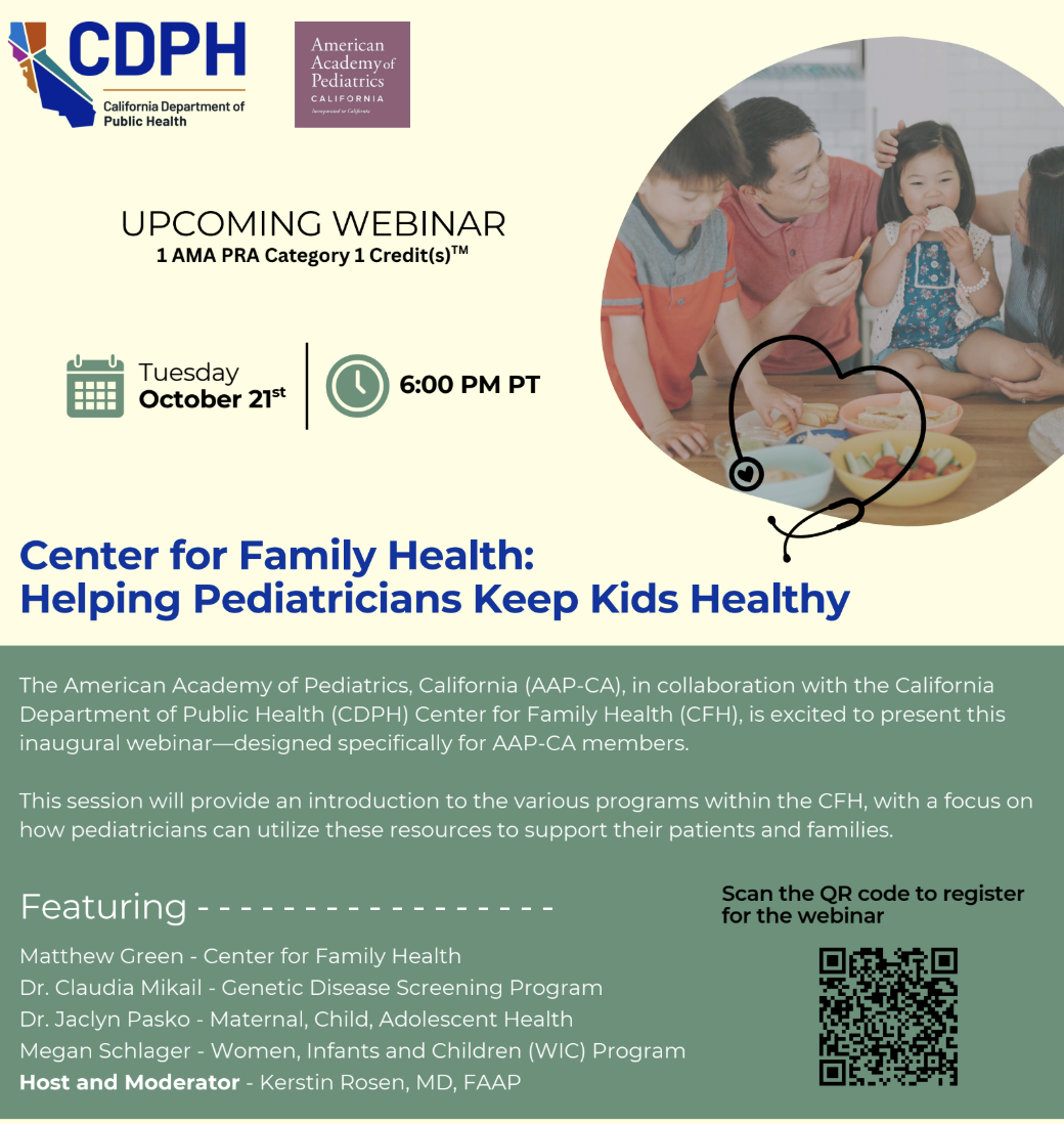 The American Academy of Pediatrics, California (AAP-CA), in collaboration with the California Department of Public Health (CDPH) Center for Family Health (CFH), is excited to present this inaugural webinar—designed specifically for AAP-CA members. This session will provide an introduction to the various programs within the CFH, with a focus on how pediatricians can utilize these resources to support their patients and families.