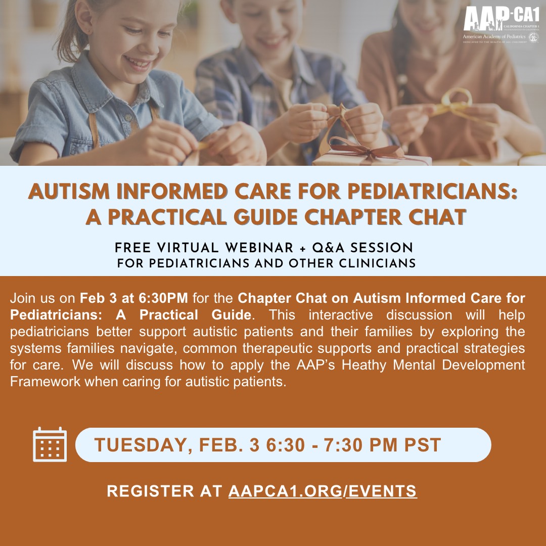 Join us on Feb 3 at 6:30PM for the Chapter Chat on Autism Informed Care for Pediatricians: A Practical Guide. This interactive discussion will help pediatricians better support autistic patients and their families by exploring the systems families navigate, common therapeutic supports and practical strategies for care.We will discuss how to apply the AAP’s Heathy […]