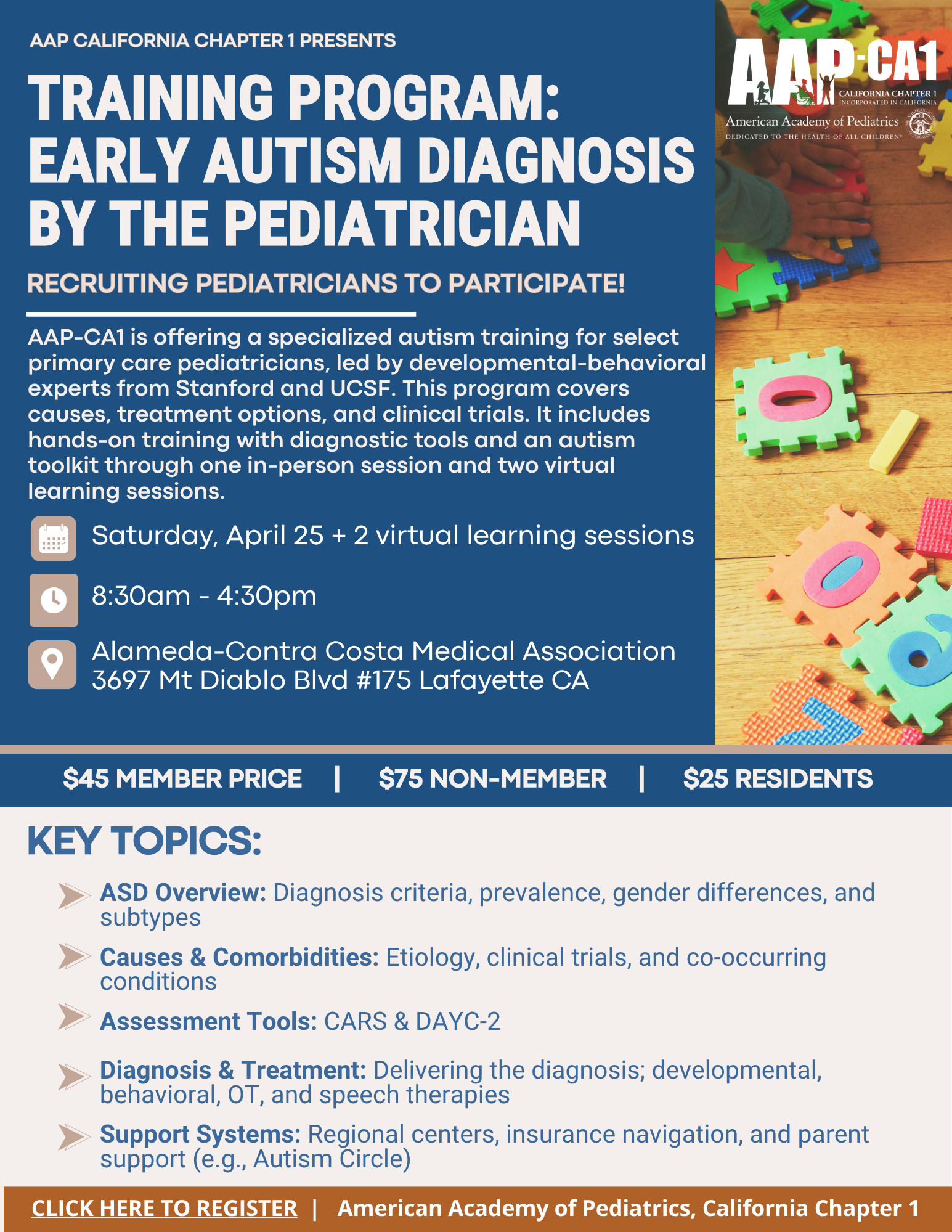 We’re excited to share a unique opportunity for pediatricians interested in expanding their skills in early autism diagnosis and care. AAP-CA1 is offering a specially designed Early Autism Diagnosis by the Pediatrician training program. The program will be held in person in Lafayette, CA, on Saturday, April 25, 2026, from 8:30 AM to 4:30 PM, […]
