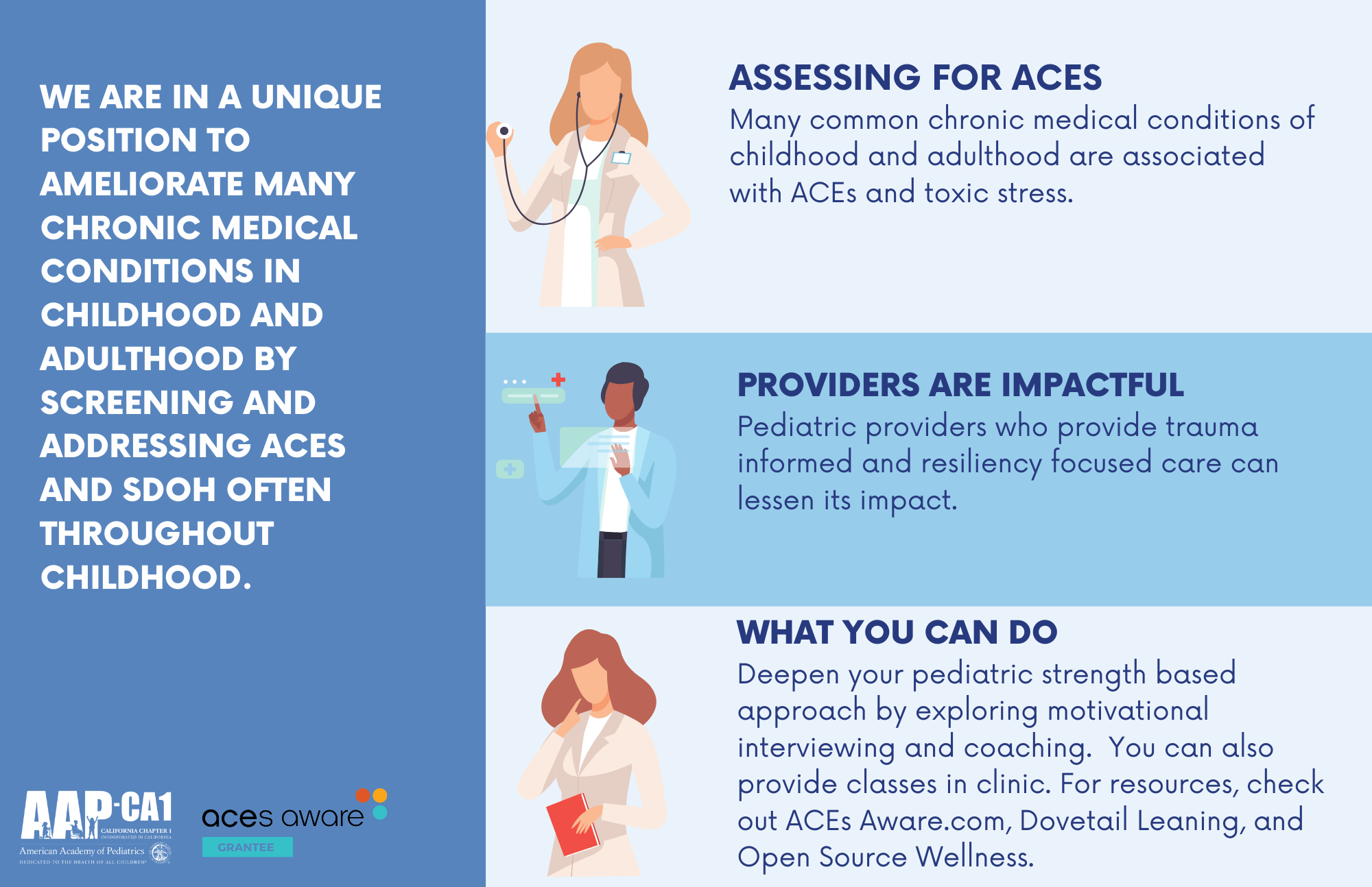 Many common chronic medical conditions of childhood and adulthood are associated with ACEs and toxic stress. Pediatric providers have a unique opportunity to prevent or at least ameliorate many chronic medical conditions in childhood and adulthood by screening and addressing ACEs and SDOH often throughout childhood. Teaching families how to raise resilient children results in resilient adult will have a lasting impact. The science of trauma and toxic stress' impact on health is a growing field with strong evidence.